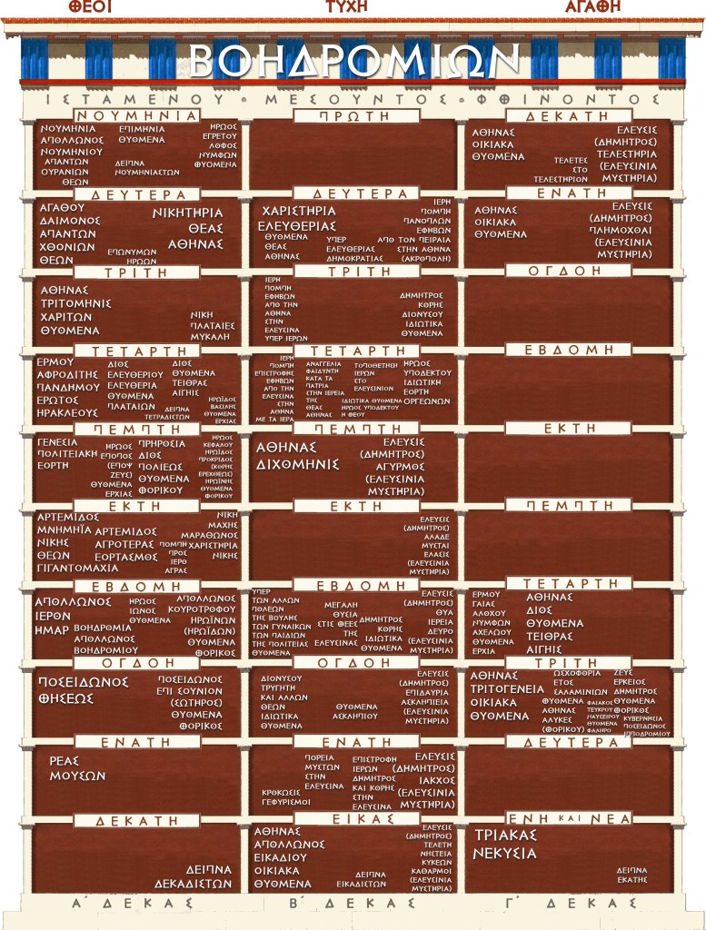 Εκατομβαιών, Μεταγειτνιών, Βοηδρομιών· τούτου του μηνός κ΄,τ.λ.