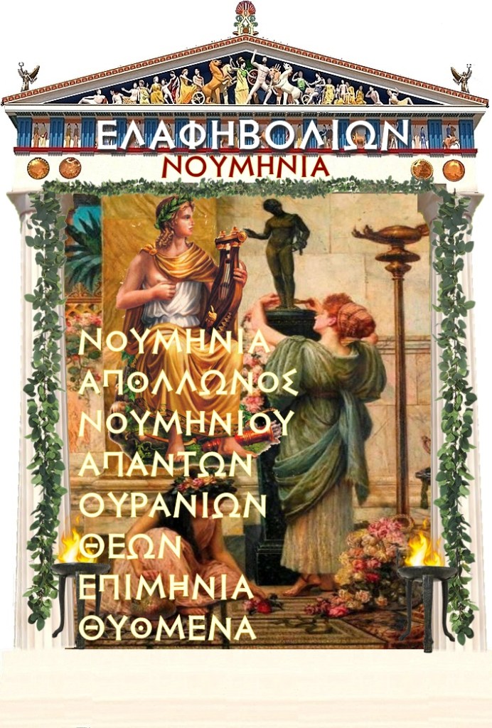 Τη σημερινή ημέρα εορτάζουμε τη νουμηνία, τη νέα σελήνη του Ελαφηβολιώνος, η ημέρα ξεκινά στη δύση του ηλίου και είναι ιερή του Νουμηνίου Απόλλωνος και απάντων των θεών.