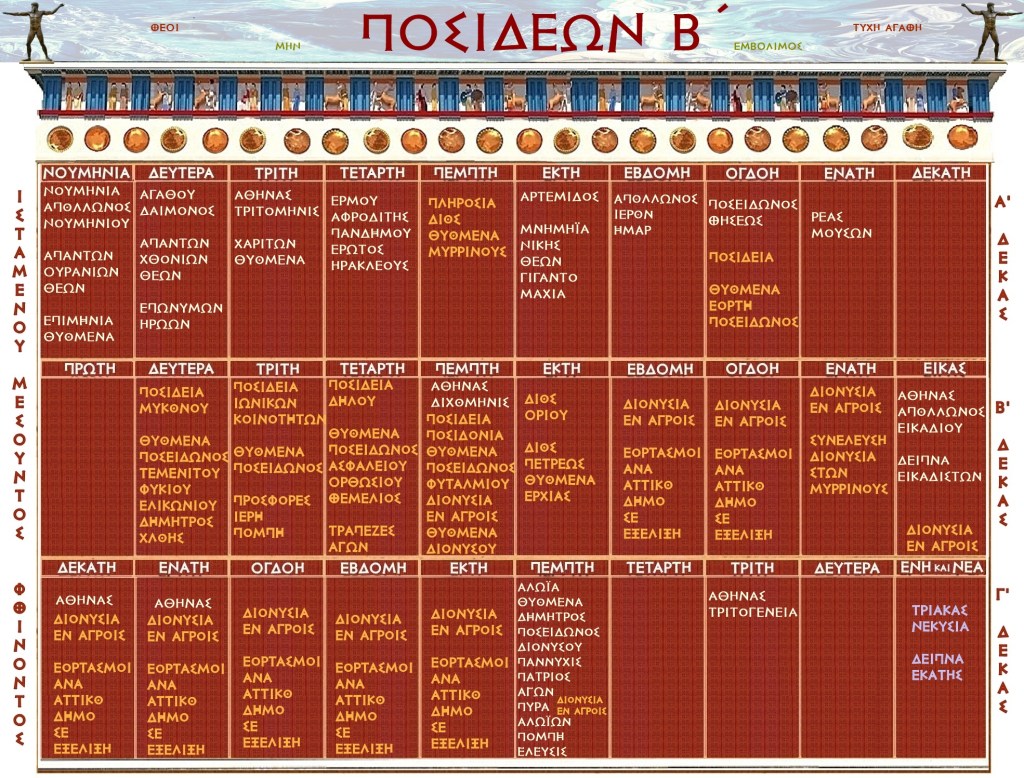 | Νουμηνία Απόλλωνος Νουμηνίου Απάντων Ουρανίων θεών Επιμήνια θυόμενα | Αγαθού Δαίμονος Απάντων Χθονίων θεών Επωνύμων Ηρώων | Αθηνάς Τριτομηνίς Χαρίτων θυόμενα | Ερμού Αφροδίτης Πανδήμου Έρωτος Ηρακλέους Δείπνα Τετραδιστών | Πληροσία θυόμενα Διός Μυρρινούς Γενική Συνέλευση της Εκκλησίας του δήμου | Αρτέμιδος Μνημηϊα Νίκης θεών Γιγαντομαχία | Απόλλωνος ιερόν ήμαρ | Ποσίδεια θυόμενα εορτή Ποσειδώνος Ποσειδώνος Θησέως | Ρέας Μουσών Συνέλευση της Εκκλησίας του δήμου | |