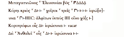 ―Μεταγειτνιῶνος, Διὶ Καταιβάτηι ἐν τῶι σηκῶι παρὰ τὸ Δελφίνιον τέλεον πρατόν · ὁρκωμόσιον παρέχεν ἐς εὐθύνας.