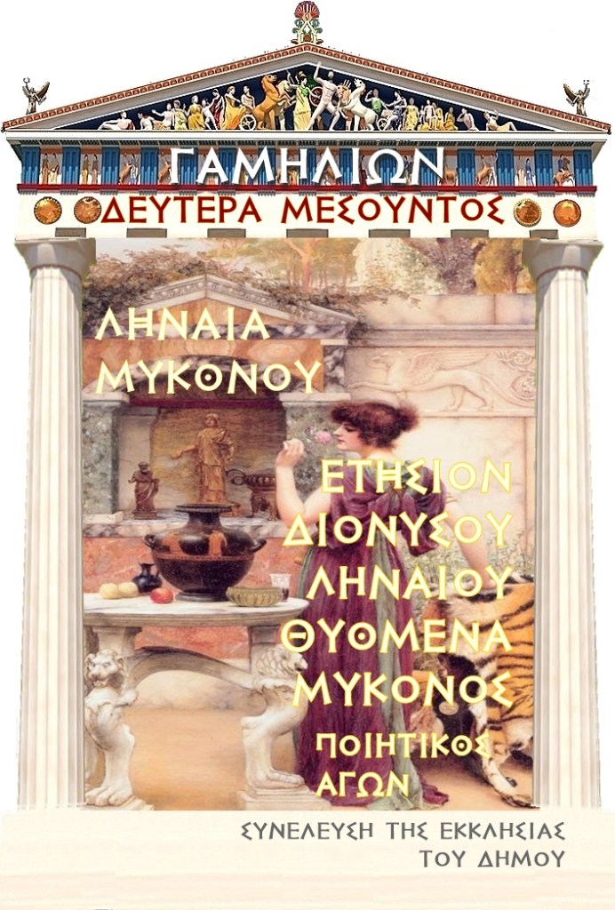 Η θυσία στον Διόνυσο Ληναίο στη Μύκονο την δωδεκάτη ημέρα του Ληναιώνος μηνός (ο αντίστοιχος ιωνικός του αττικού Γαμηλιώνος), δηλώνει ότι ίσως την 12η του Γαμηλιώνος αρχίζουν τα Λήναια στην Αθήνα με τους ποιητιούς Αγώνες.