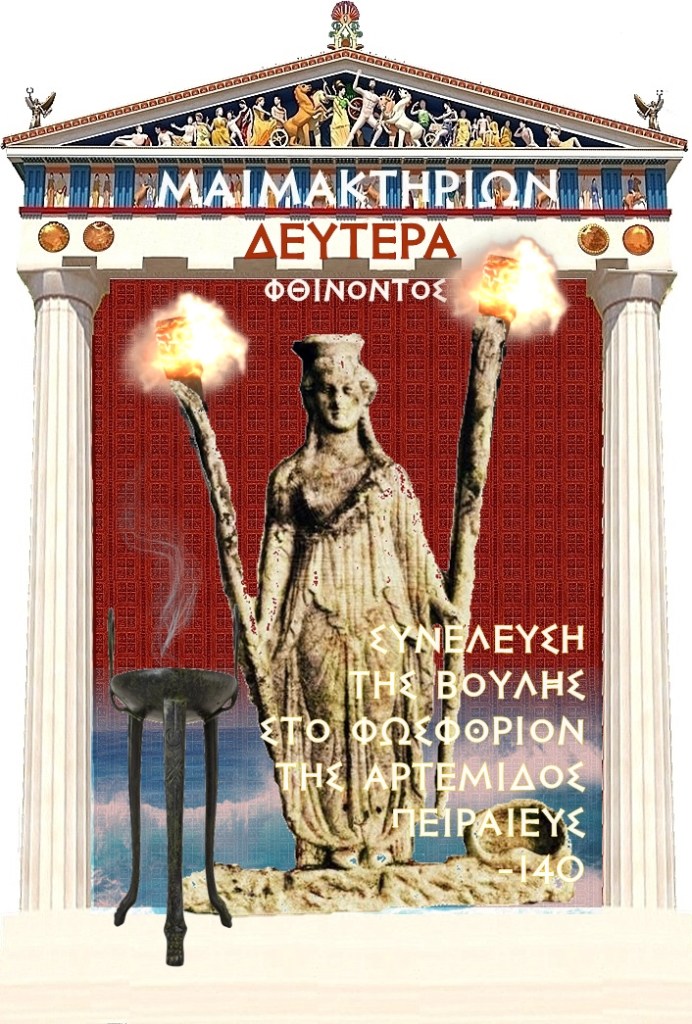 Με την σημερινή Συνέλευση της Βουλής στο Φωσφόριο της Αρτέμιδος στον Πειραιά ολοκληρώνεται ένας κύκλος τελετών Δήμητρος και της Κόρης και αρχίζει ένας άλλος για την περίοδο του Χειμώνος για αυτές τις θεές. τεῖ̣ Δήμητρι καὶ τεῖ Κόρει ὑπὲρ τῆς βουλῆςΤο λατρευτικό επίθετο Φωσφόρος δεν είναι πολεμικό, πολεμική πτυχή προσδίδουν οι Ρωμαίοι και εμφανίζεται στην αφήγηση του Κλήμεντος της Αλεξάνδρειας. Στην Αρτέμιδα είναι ένα από τα πολλά σχετικά επίθετα που εφαρμόστηκαν από τον – 5ο αιώνα το νωρίτερο. Έχουμε την Φωσφόρο, που «φέρει το φως» και πιστοποιείται στην Ιφιγένεια εν Ταύροις 11, ενώ το συνώνυμο «φαεσφορία» εμφανίζεται στον 11ο στ. του Ύμνου του Καλλιμάχου προς την Αρτέμιδα. Αμφίπυρον – «Με την πυρά και στα δύο (χέρια)» ή, λιγότερο πιθανό ίσως, «με έναν φανό και στα δύο (χέρια)» – εμφανίζεται στις Τραχινίαι του Σοφοκλέους, στ. 214. Η Φωσφόρος χρησιμεύει ως λατρευτικό επίθετο της θεάς, κυρίως στην Μεσσήνη στην Πελοπόννησο, όπου το λατρευτικό άγαλμα της Αρτέμιδος Φωσφόρου σμιλεύτηκε από τον Δαμοφώντα τον -2ο αιώνα (Παύσ. 4.31.10). Με βάση τα αναθηματικά κεραμικά που βρέθηκαν στην τοποθεσία, η εικόνα αυτού του αγάλματος μπορεί να ανακατασκευαστεί προσωρινά. «Τα περισσότερα αναθηματικά είναι κεραμικά ειδώλια και παριστάνουν την Αρτέμιδα να φορά ένα κοντό ιμάτιο με υπερδιπλωμένο από πάνω ένα δέρμα ελαφιού (νεβρίδα), τυλιγμένο γύρω από το σώμα και δεμένο με ζώνη• η ουρά του ζώου κρέμεται προς τα κάτω μεταξύ των μηρών της, ένα από τα στήθη της και ο αντίστοιχος ώμος της μένουν γυμνοί. Φορά ψηλές δερμάτινες μπότες και φέρει διάδημα στο κεφάλι της, κρατάει μια αρκετά υψηλή λαμπάδα (λαμπάς) κοντά στην αριστερή της πλευρά, ένας σκύλος που κάθεται στο δεξί της πόδι γυρίζει το κεφάλι του προς τα πάνω – Θέμελης 1994» Γιατί λοιπόν η Άρτεμις φέρει λαμπάδες; Μέρος της απάντησης σχετίζεται με το ρόλο της ως θεάς κυνηγιού. Το ποίημα του Αλκμάνος αναφέρει ότι η Άρτεμις «τραβά το μακρύ της τόξο τη νύχτα». Είναι εξαιρετικά δύσκολο, και επικίνδυνο, να τραβήχτεί ένα τόξο ειδικά όταν κάποιος κρατάει έναν φλεγόμενο πυρσό, έτσι εδώ ο Αλκμάν εμφανίζει την μη συσχέτιση του πυρσού με το κυνήγι.Η φλογιστή πτυχή της Αρτέμιδος υιοθετήθηκε όταν η θεά ξεκίνησε το συγκριτικό μέρος του χαρακτήρα της με τη θεά Εκάτη, για την οποία η φλόγα είναι το χαρακτηριστικό της. Ένας από τους σημαντικότερους ρόλους αυτής της θεάς στην πρώιμη ελληνική λογοτεχνία είναι αυτός που βοήθησε τη Δήμητρα να αναζητήσει και να υποδεχθεί την Κόρη στον Ομηρικό Ύμνο για τη Δήμητρα. Η φλόγα είναι ένα κοινό θέμα στην εικονογραφία της Ελευσίνας, που σχετίζεται με τη νυχτερινή αναζήτηση για την Κόρη που είναι απούσα και οι τελετές αφορούν τον Κάτω Κόσμο και γενικότερα την χειμερινή περίοδο. Επιγραφικά στοιχεία από την Αθήνα, τη Βοιωτία και το νησί της Θάσου δείχνουν ότι η Άρτεμις και η Εκάτις άρχισαν να συγχωνεύονται ως ταυτότητες τον -5ο αιώνα , και ως εκ τούτου διεδόθει μια κοινή χρήση εικονογραφικών χαρακτηριστικών από αυτήν την περίοδο και μετέπειτα.