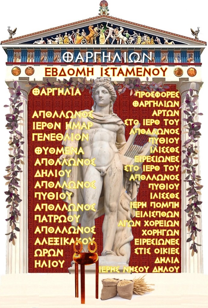 ― Ο δέ Απόλλων ούτος έστιν ώ τα Θαργήλια άγουσι, και διασώζεται Φλυήσιν εν τω δαφνηφορείω γραφή περί τούτων.