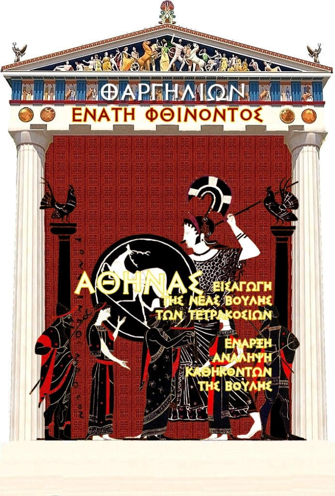 Σήμερα , τὸ -411, οἱ Τετρακόσιοι (ἡ βουλὴ τῶν Τετρακοσίων, μέλη ἀπὸ κάθε φυλή τῶν Ἀθηναίων) αναλαμβάνουν τὰ καθήκοντα τους πριν από το επερχόμενο νέον έτος των Ελλήνων: