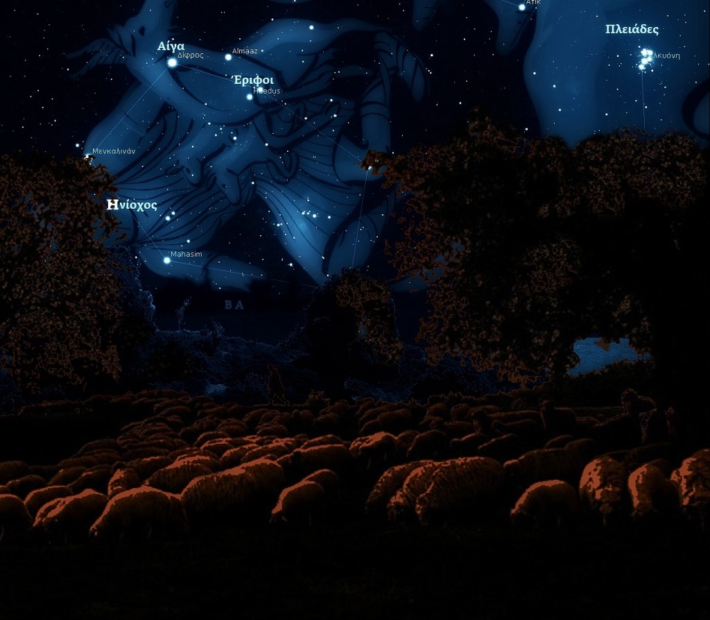 Η Αίγα, και οι Έριφοι, οι αστέρες του Μαιμακτηριώνος, οι φορείς των Μαιμακτηρίων, η γέννηση της Αθηνάς, οι Καταιγίδες και η αρχή του χειμώνος.