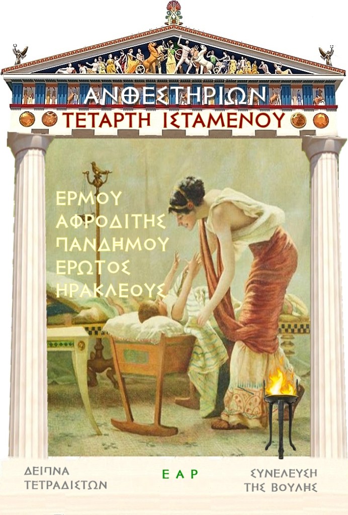 Σήμερα, επίσης, πραγματοποιείται η μηνιαία οικιακή εορτή αφιερωμένη στον Ερμή, την Αφροδίτη πάνδημο, τον Έρωτα, και τον Ηρακλή.