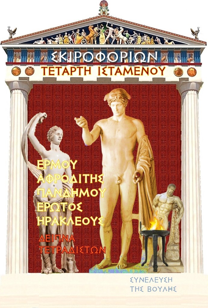 Σήμερα τελείται ἡ καθιερωμένη μηνιαία οικιακή ἑορτὴ ἀφιερωμένη στὴ λατρεία τοῦ Ερμού, τῆς Ἀφροδίτης Πανδήμου, τοῦ Ἔρωτος και του Ηρακλέους.