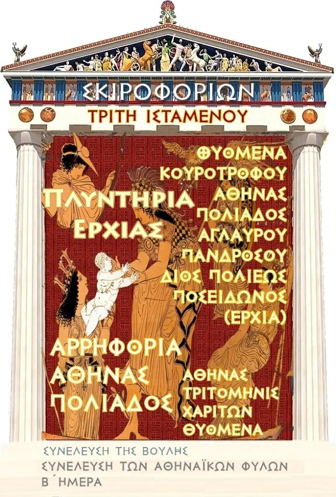 Αυτές οι θυσίες πραγματοποιούνται -εμ Πόλε Ερχιάσι, και ο Jameson προτείνει ότι η πολιτειακή εορτή των Αθηνών ίσως να πραγματοποιόταν την 3η του Σκιρροφοριώνος ή «περί της».