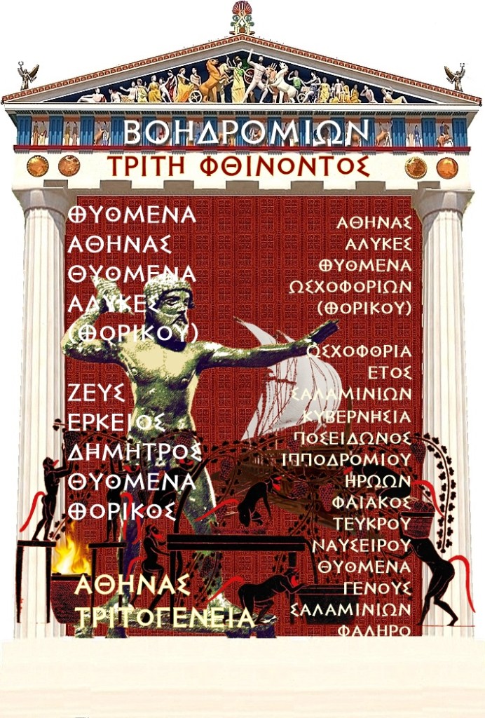 ― Βοηδρομιῶνος· Ποσειδῶνι Ἱπποδρομίωι ὗν :ΔΔΔΔ, ἥρωι Φαίακι χοῖρον ΗΗΗΙΙΙ, ἥρωι Τεύκρωι χοῖρον ΗΗΗΙΙΙ, ἥρωι Ναυσείρωι χοῖρον ΗΗΗΙΙΙ·