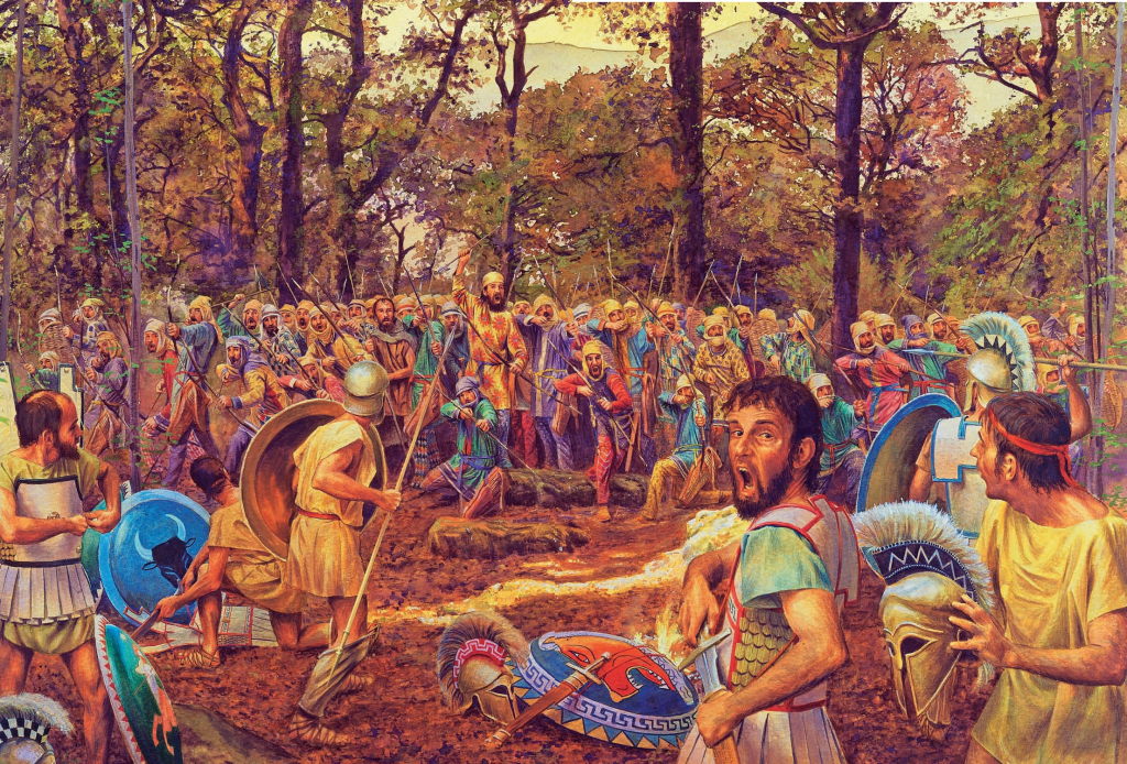 Μπροστά τους η απάνεμη σιωπή της νύχτας έσπασε καθώς οι Φωκείς οπλίτες πήραν βιαστικά θέσεις για τη μάχη τους.Σε αυτή την περίοδο της Ιστορίας, πολλοί οπλίτες είχαν εγκαταλείψει τη χάλκινη πανοπλία σε σχήμα καμπάνας (Θώραξ) που φορούσαν συνήθως οι παππούδες τους και αντ ‘αυτού φορούσαν έναν ελαφρύτερο, πιο εύκαμπτο λινό θώρακα , ο Λινοθώραξ. Αποτελούνταν από πολλά στρώματα λινού κολλημένα μεταξύ τους για να σχηματίσουν ένα σκληρό θώρακα, ο οποίος ενισχύονταν με πλάκες από σίδηρο ή μπρούτζο. Ο Λινοθώραξ έχει τις Πτέρυγες στην μέση και τα μεγάλα ανοίγματα για τη κίνηση των χεριών στους ώμους. Το στήθος προστατεύεται με την Ασπίδα.
