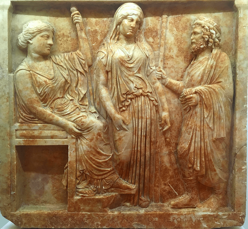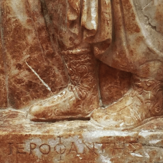 Στο ανάγλυφο (εικ.) του ιεροφάντη από τον δήμο Αγνούντος είναι ντυμένος με μανδύα που είναι τυλιγμένος γύρω του με τέτοιο τρόπο ώστε σχεδόν ολόκληρο το σώμα του από το λαιμό του μέχρι την κορυφή των μποτών του να είναι σκεπασμένος.