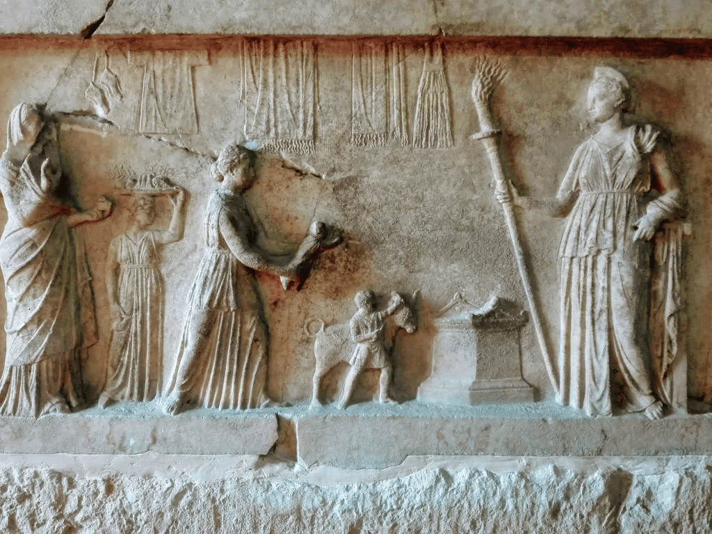 Συγκεκριμένα, απεικονίζει μια θυσία που κάνει η οικογένεια (ή τουλάχιστον τα θήλεια μέλη της) στην Αρτέμιδα ως ευγνωμοσύνη για την ασφαλή γέννηση του παιδιού που βρίσκεται στο επίκεντρο της σύνθεσης. Λαμβάνοντας υπόψη τη σημασία της Αρτέμιδος στον τοκετό, δεν προκαλεί έκπληξη να δούμε αυτό το ανάγλυφο ως αφιερωτικό — η οικογένεια θέτει συγκεκριμένα το βρέφος υπό την προστασία της Αρτέμιδος.