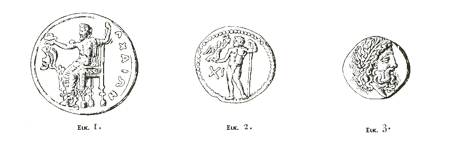 [18] Ο W. Wroth στο Num. Chron. Τέταρτη Σειρά 1902 ii. 324 στ. πιν. 16, 4, G. F. Hill Historical Greek Coins London 1906 σελ. 73 στ. πιν. 5, 38, Head Hist. num.² σελ. 416 («ο οπίσθιος τύπος του Διός φαίνεται να προτάθηκε από τον ένθρονο Δία στα πρώιμα αρκαδικά νομίσματα» Cp. infra ch. i § 3 (b)). Το νόμισμα βρίσκεται τώρα στο Βρετανικό Μουσείο.